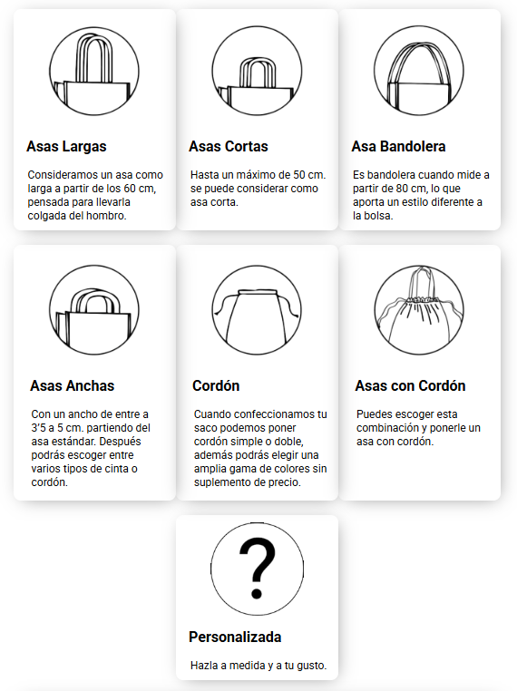 Choose between two handles, one, wider, thinner, longer, shorter, shoulder strap style... Or finish off your design with a single or double drawstring closure.